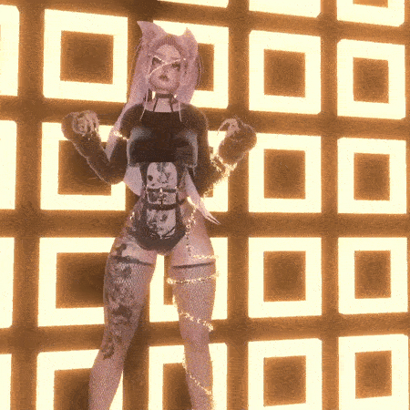 Angelbites, Bodysuit, Bra, Chains (Armband, Arm, Face, Leg), Ears, Fishnets, Heels, Long hair, Long nails, Short nails, Panties, Pasties, Ponytails, Septum, Shirt, Tail, Waistband